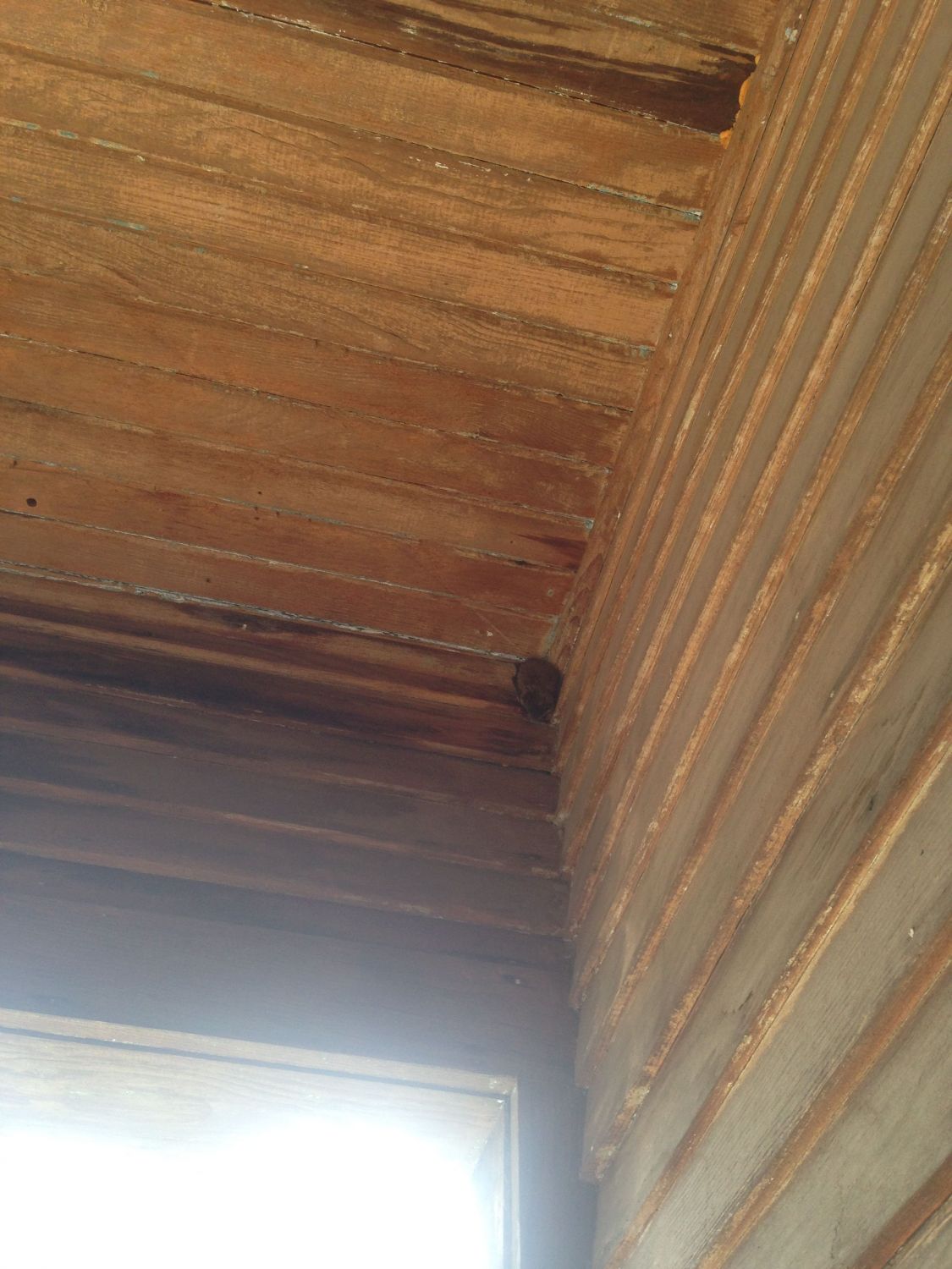 The porch is inset into the body of the house, and has three walls and a beadboard ceiling. At first I did not see anything. Then…then…I thought: What is that in the upper corner? WHAT IS THAT?